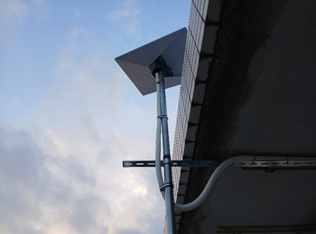 また、アンテナ本体の設置にあたっては、軒を超えて配線を通す必要があったため、伸縮式の支持金具を採用。さらに安定性を確保するために、2つの金具でしっかりと固定を行い、強風などにも配慮した設計で安全性を高めています。